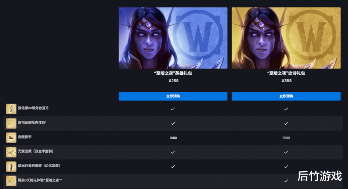 截稿之时,国服公告未更新,是否有实体典藏版还未知。由于国服不用CD-Key,无须购买新资料片,已推出了“至暗之夜”的两款数字礼包:英雄礼包和史诗礼包,分别售价258和388元,购买礼包其一将在北京时间12月4日开启家宅系统的抢先体验。