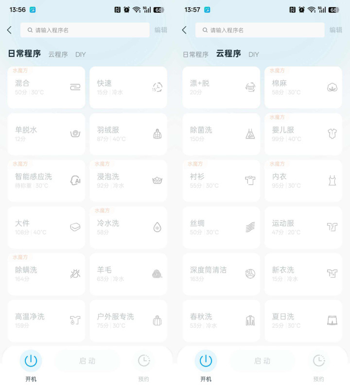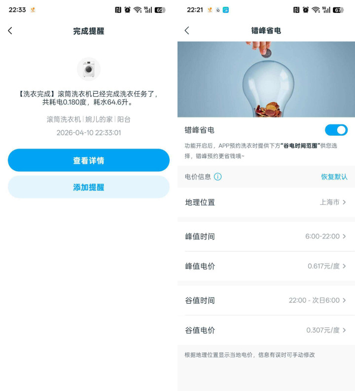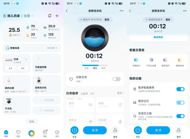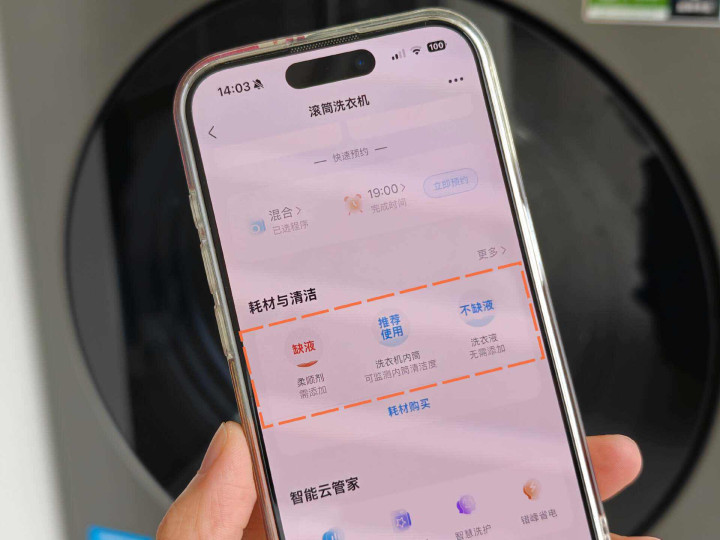 除了日常的选择程序、预约洗衣、查看洗衣液/柔顺剂余量等操作外,还可以查看耗电量和用水量情况,并且能和家里的洗碗机、空调等智能家电一起设置错峰省电。
