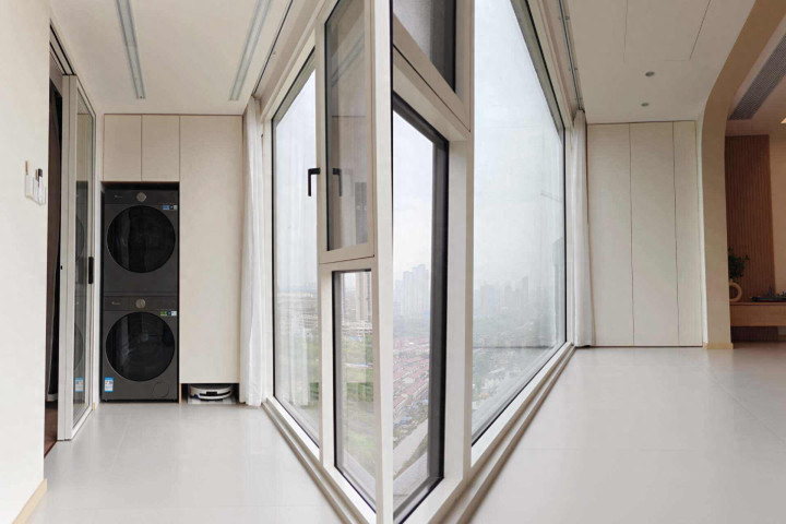 “四面纯平”不光实用,看着也很高级。洗衣机跟柜子严丝合缝,完全在一个平面上,它不再是一台冰冷的“大机器”,更像是家里柜子本身的一部分。这种“隐身”效果特别适合现代风、极简风、开放式阳台或客餐厨一体的设计,洗衣机完全融入家居环境,整体美感再+1。