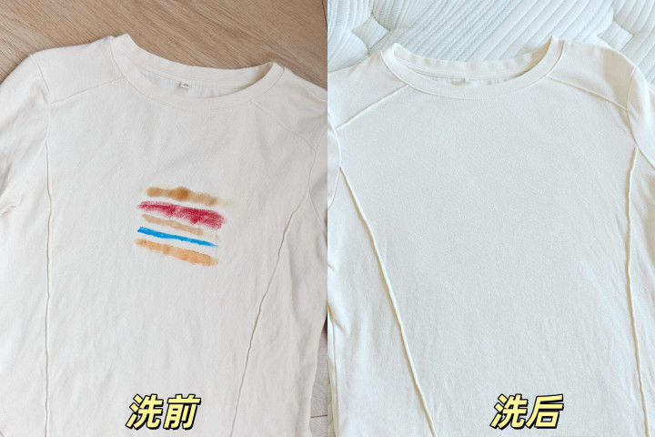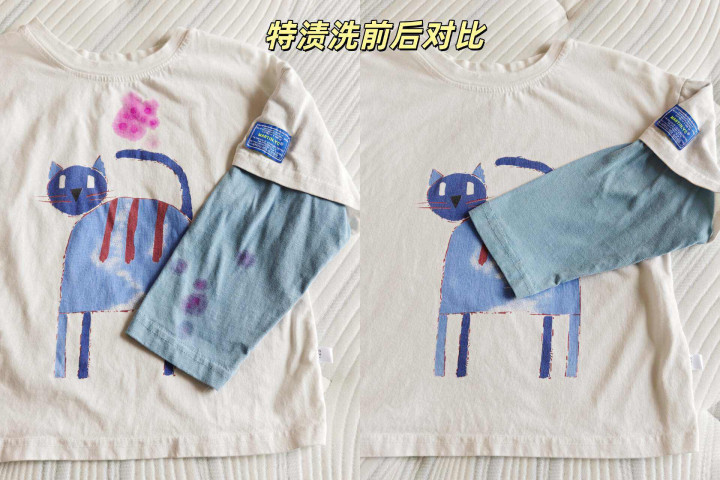 为了验证它的实际清洁能力,我特意在杏白的T恤上涂抹咱们生活里常见的脏污:生抽、口红、粉底液、马克笔和番茄酱汁,清洗后的T恤如图所示,其洁净力一目了然。