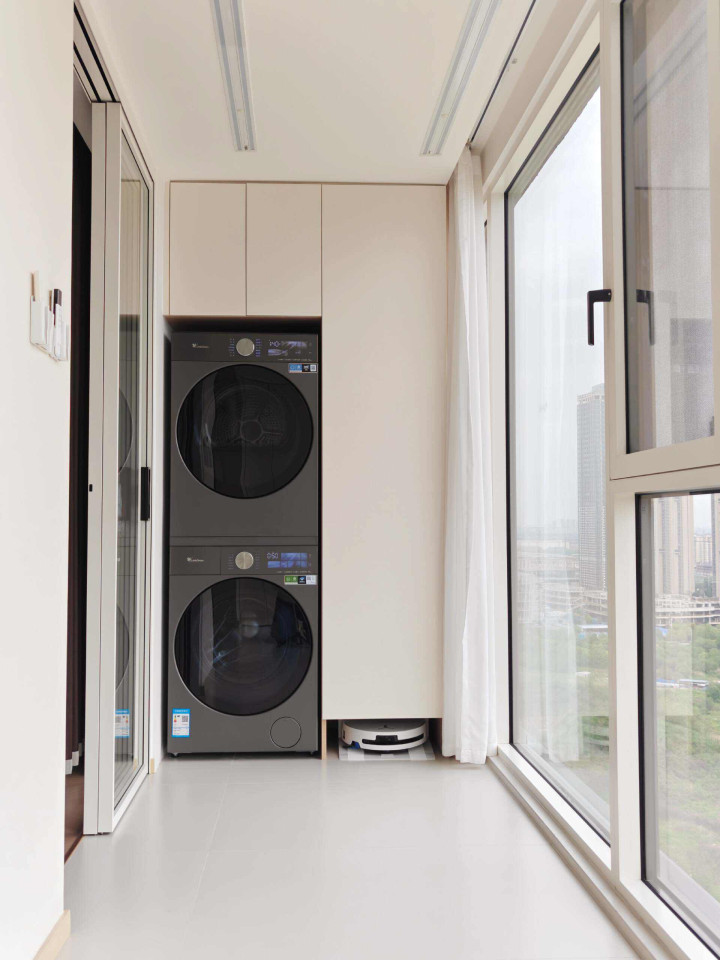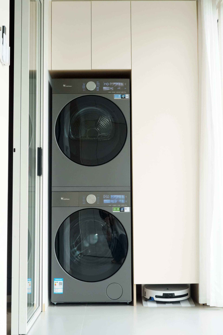 谈及新家装修后必入的大家电,洗烘套装绝对榜上有名。婉儿家在装修时,特意在阳台左侧预留了清洁柜,整合放置洗烘套装、扫地机器人和内衣洗衣机,吊顶内也预装了隐形晾衣架,方便偶尔应急。阳台右侧则做生活储物柜,用于收纳不常用物品。两侧规划,动静分离,原本以为考虑得很周全了,直到遇到了小天鹅跨代机皇小乌梅5.0(TG10K60+TH10K60)洗烘套装,才发现,其实还可以更好。
