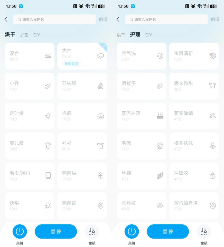 烘干护理的程序方面,烘干有羽绒服、羊毛、风衣、棉麻、摇粒绒、户外服、婴儿服、冲锋衣、丝绸、牛仔、毛巾/浴巾、除菌烘、支架烘等23种程序,护理有空气洗、晒被子、毛呢、丝绸、冲锋衣、萌宠除螨、蒸汽护理等12种护理模式。