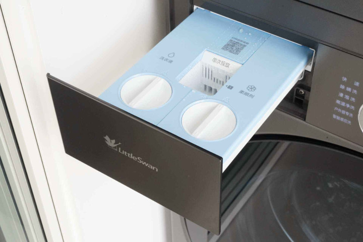 它的洗涤剂和柔顺剂是分开的模块化设计,每一个都可以单独取出来,这意味着我们终于可以彻底清洗投放盒了。